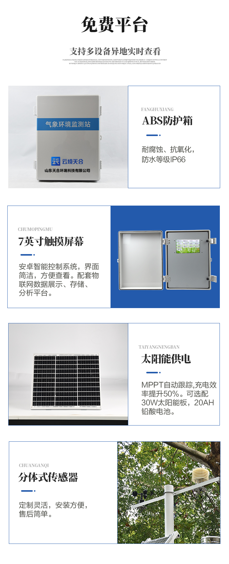 3.太陽(yáng)能供電、配置鉛酸電池,可選配30W 20AH/50W 20AH/100W 100AH.充電控制器:150W,MPPT自動(dòng)功率點(diǎn)跟蹤,效率提高20%